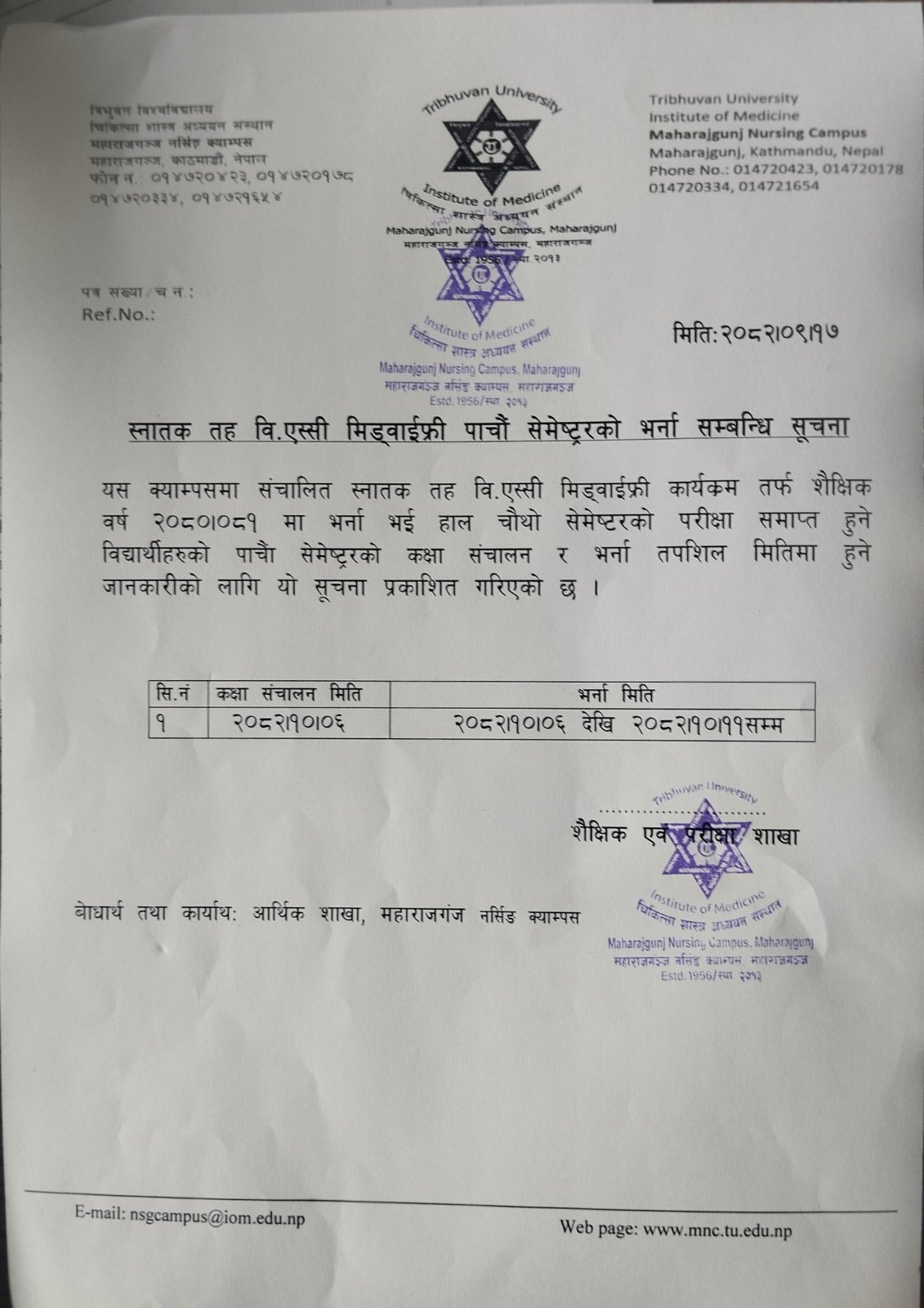 B.Sc. Midwifery 5th Semester Admission Notice 2082
