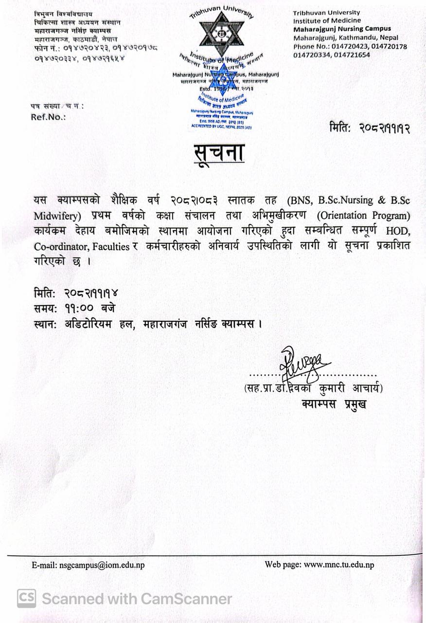 Notice for BNS, B.Sc. Nursing & B.Sc. Midwifery Orientation Program 2082