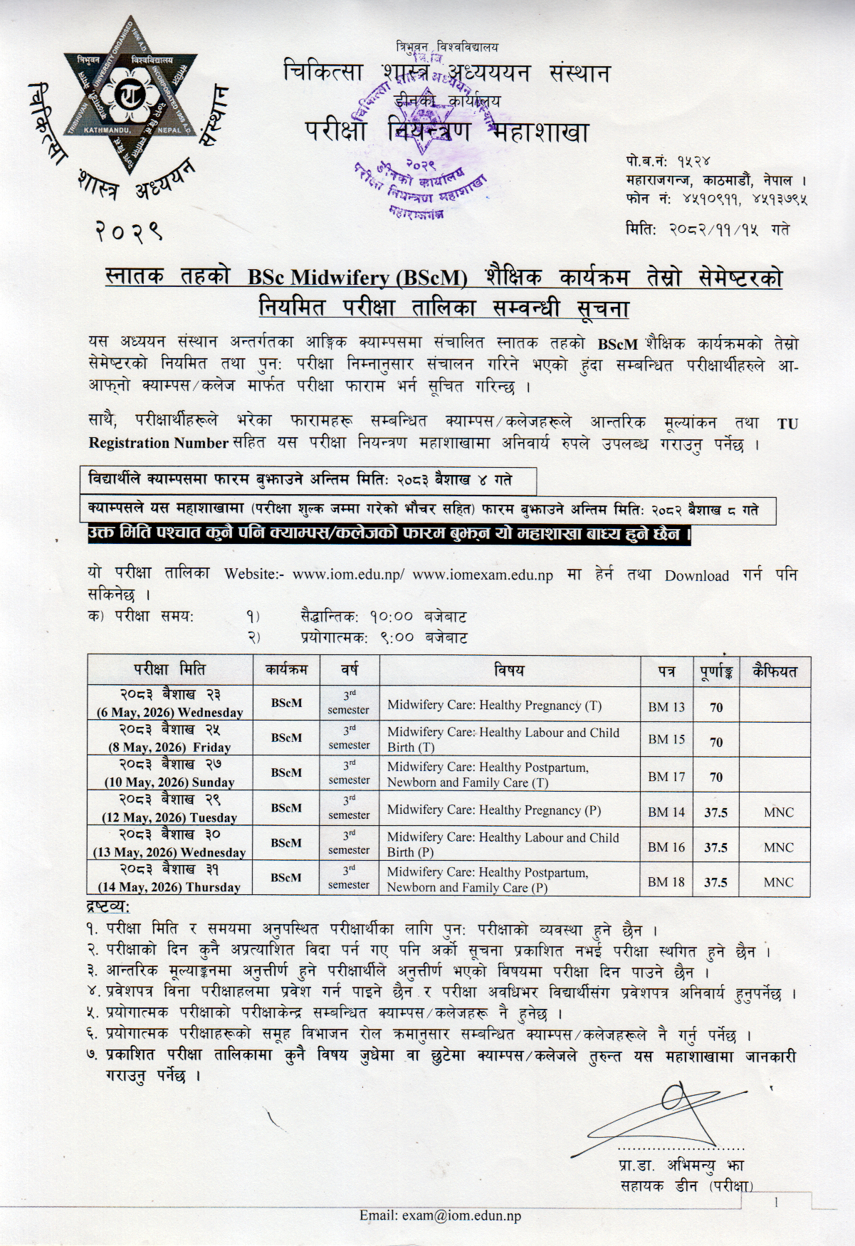 Routine of the B.Sc.Midwifery (BScM) 3rd Semester Regular Exam 2083
