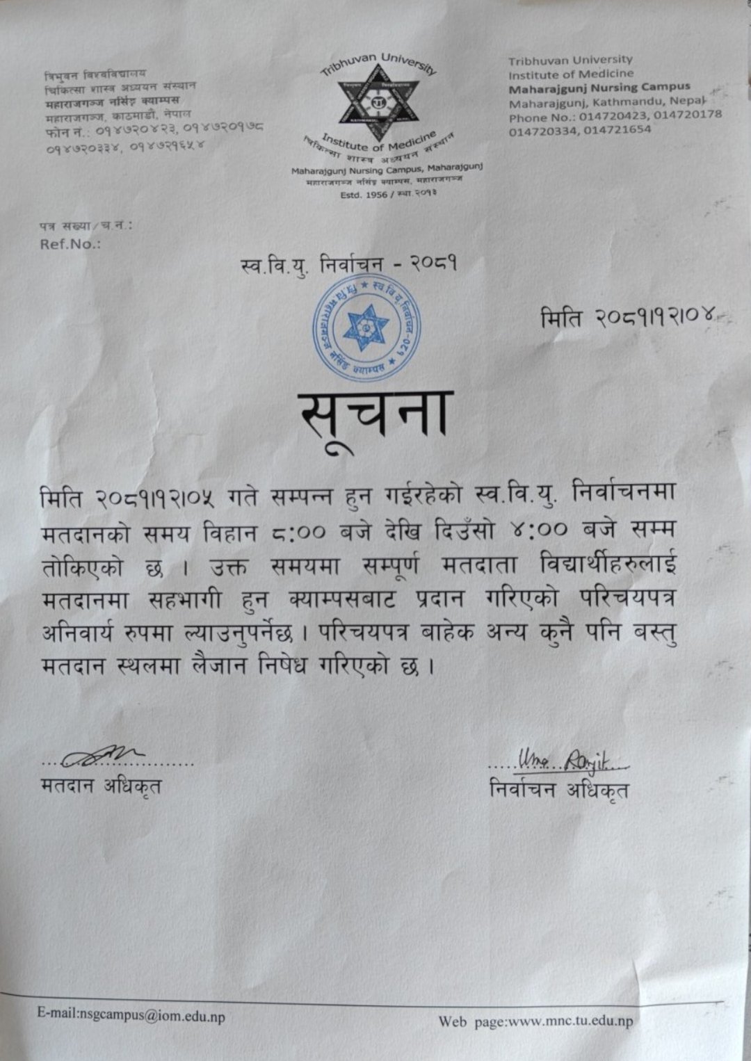 Notice of BNS, B.Sc. Nursing & B.Sc.M, Wrap-Up Matching MEC Seat Vacant Admission Notice 2082