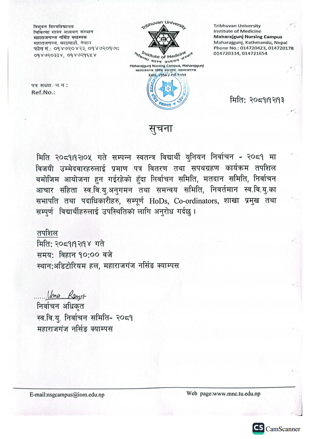 Notice of BNS, B.Sc. Nursing & B.Sc.M, Wrap-Up Matching MEC Seat Vacant Admission Notice 2082