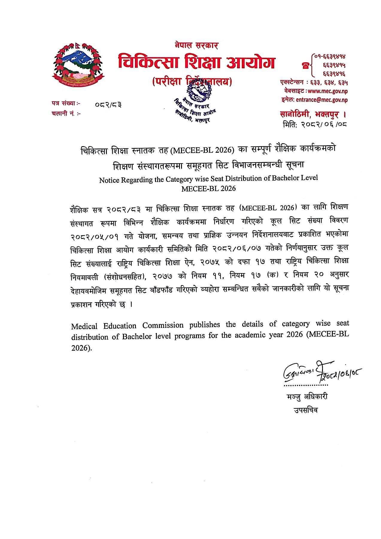 चिकित्सा शिक्षा स्नातक तह (MECEE-BL 2026) का सम्पूर्ण शैक्षिक कार्यक्रमको शिक्षण संस्थागतरुपमा समूहगत सिट विभाजनसम्बन्धी सूचना !!